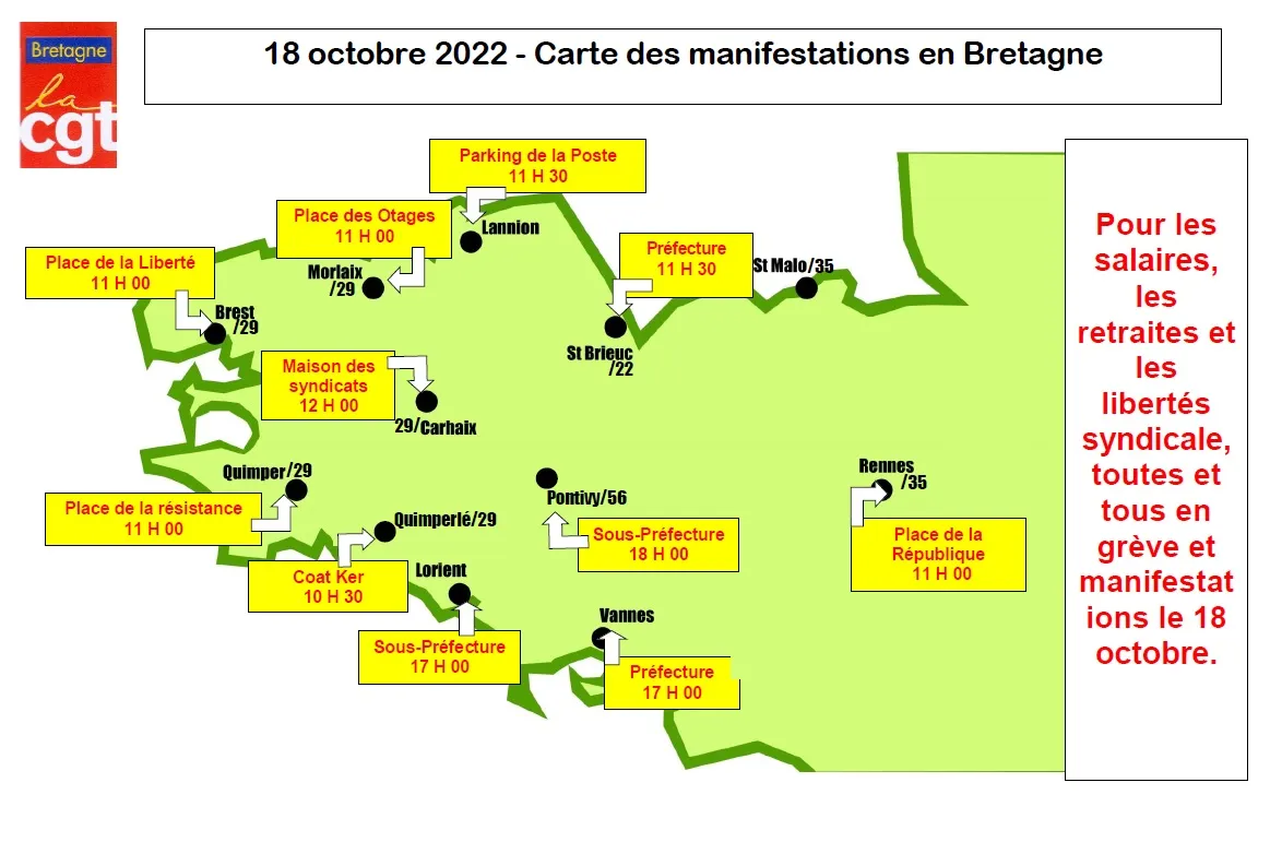 Si vous avez un doute sur la circulation de votre train, rendez-vous sur le site des TER Breizh Go, le fil twitter ou SNCF Connect l’application. En Bretagne, 12 rassemblements sont annoncés : à Rennes, Pontivy, Vannes, Lorient, Saint-Brieuc, Lannion, Carhaix, Quimperlé, Morlaix, Quimper, Dinan ou encore Brest.