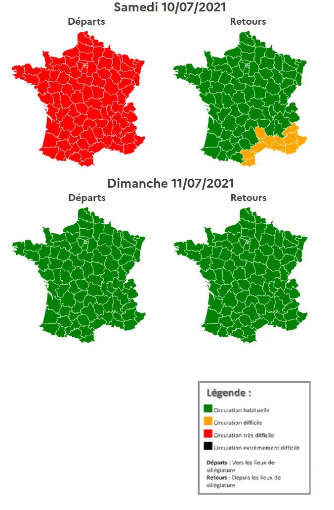 Bison futé classe la journée du samedi 10 juillet rouge dans le sens des départs. Il est vivement conseillé de traverser les grandes agglomérations tôt ce matin ou en fin d'après-midi.